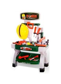 Wyposażenie zestawu:: stolik, klucze, śruby, nakrętki, piła, młotek, kombinerki, śrubokręty, imadło, kątowniki, kask, naklejki. Wymiary: 34x44x75cm. Zabawka dla dzieci w wieku od 3 lat.
