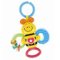 Radosna grzechotka jest niezwykle funkcjonalna oraz atrakcyjna. Kiedy maluch potrząsa zabawką słyszy grzechoczące krążki znajdujące się na skrzydełku ?Pszczółki?. Przyciskanie centralnie umieszczonego przycisku aktywizuje dźwięki oraz migoczące światełko. Grzechotka posiada również specjalny uchwyt, dzięki któremu możemy zawiesić ją przy łóżeczku, w wózku bądź w innym, dowolnym miejscu. Wymaga trzech baterii AG13 1,5V.