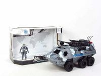 Duży plastikowy model transportera opancerzonego ze światłem i dźwiękiem. Zabawka z napędem sprężynowym. W komplecie figurka żołnierza. Dla dzieci w wieku od 3 lat.