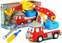 Co ciekawe, w zestawie autka znajdują się plastikowe narzędzia, dające możliwość na jeszcze lepszą zabawę. Klucz nastawny i śrubokręt są idealnie dopasowane do wymiarów plastikowych śrubek, za pomocą których zamontowana jest drabina czy zderzak. Wedle swoich upodobań, mały strażak może odkręcić od wozu armatkę wodną, rozsuwaną drabinę, obrotowy pulpit bądź zderzak znajdujący się w tylnej części pojazdu. Warto zwrócić uwagę na szereg możliwości płynących z takiego rozwiązania. Od teraz zabawka nie jest integralną całością - można ją rozłożyć i bawić się po swojemu, rozwijając wyobraźnię.