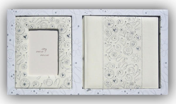 Ekskluzywny zestaw prezentowy zamknięty w pudełku. Zestaw zawiera album i ekoskórową ramkę w tym samym deseniu o wymiarach 10 x 15 cm. Elegancki album z kolekcji ślubnej wykonany z kremowej eko skóry. Okładka albumu ozdobiona arabeskowymi wzorami przeplatanymi srebrną nitką Album kieszeniowy, szyty wraz z miejscem na opis fotografii. Możliwość włożenia 200 zdjęć o wymiarze 10 x 15 cm. ( 2 zdjęcia na stronie ) Set posiada wymiary zewnętrzne 40 x 27 cm.