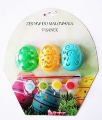 Zestaw do malowania pisanek pozwoli na wykonanie niepowtarzalnych wzorów na wielkanocnych jajkach. Wystarczy przyłożyć szablon do średniej wielkości jajka i nanieść wybrane kolory farbek do zagłębień w szablonie. Po zakończeniu pracy należy umyć szablony i pędzelek po bieżącą wodą z dodatkiem detergentu. Szablony można również wykorzystać do ozdobienia jajek flamastrami.