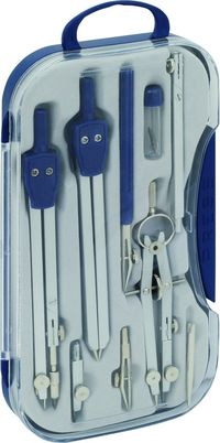 ? 9 elementów w zestawie: cyrkiel 140 mm, zerownik, przenośnik, grafion, uchwyt grafionu, zapasowy grafion, zapasowa szpilka, przedłużacz, zapasowy grafit z uchwytem